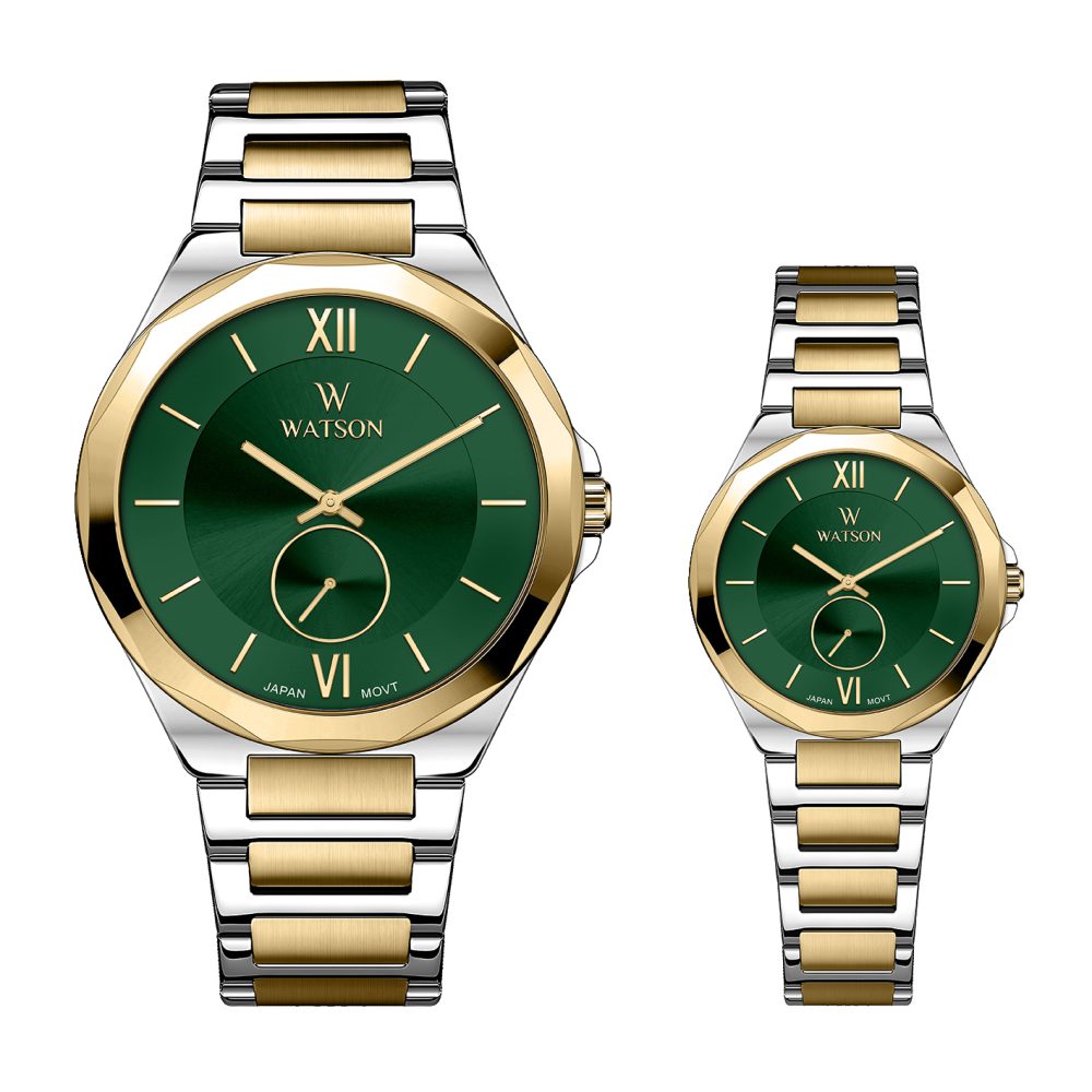 ساعت ست واتسون مدل W1213GL انتخابی هوشمندانه برای زوج‌هایی است که به هماهنگی استایل، کیفیت ساخت و اصالت برند اهمیت می‌دهند. این ست با ترکیب رنگ نقره‌ای–طلایی و صفحه سبز خاص، دقیقاً برای موقعیت‌های رسمی و کلاسیک طراحی شده و به‌راحتی با پوشش مجلسی و اداری هماهنگ می‌شود. استفاده از موتور کوارتز ژاپنی تضمین دقت بالا و دوام طولانی‌مدت را فراهم کرده و شیشه معدنی در برابر خط‌وخش‌های روزمره مقاومت مناسبی دارد. اگر به‌دنبال یک ساعت ست اورجینال با طراحی متفاوت و ارزش خرید بالا هستید، W1213GL بدون اغراق یکی از منطقی‌ترین گزینه‌ها در بازه قیمتی خود است که می‌توانید با خیال راحت ازیونیک واچ تهیه کنید.